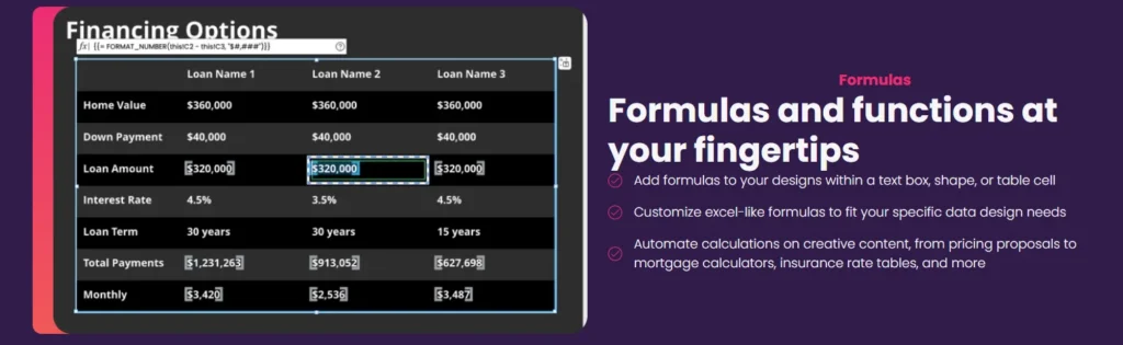 Marq supports Excel-like formulas directly in text boxes, shapes, or table cells to automate calculations inside creative content. This helps teams keep pricing, rates, or other calculated values accurate across assets like proposals, mortgage calculators, and rate tables, without manual edits.