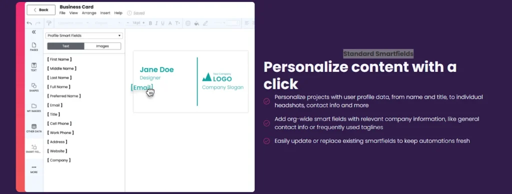Standard Smartfields let users personalize projects with profile data like name, title, headshots, and contact info. Teams can also set org-wide Smartfields for consistent company details, such as shared contact info or approved taglines, and update or replace fields as needed to keep automations current.