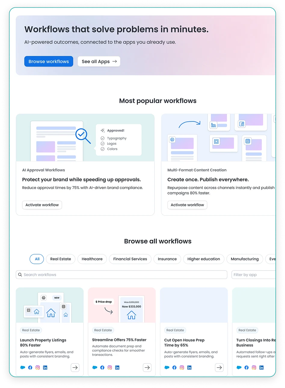 Publish on-brand campaign collateral in one step. Events, launches, or promotions go live faster than ever.