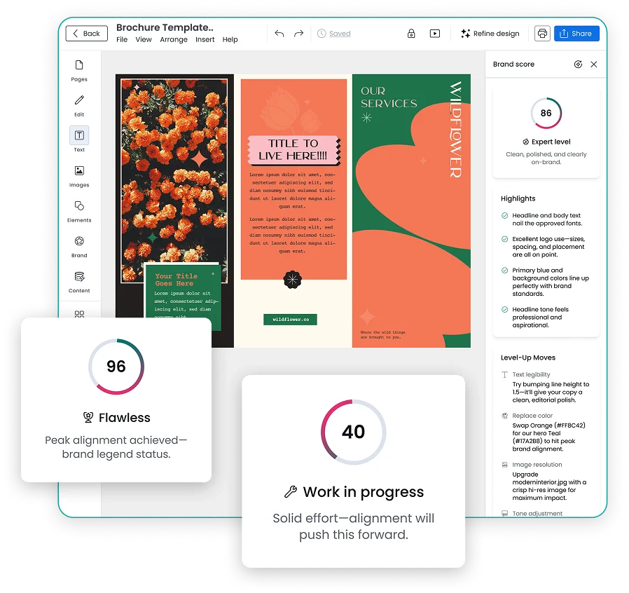 Real-time brand scoring appears live inside templates, guiding users to stay on‑brand without heavy oversight. No more guessing if something's on-brand or waiting for approval.